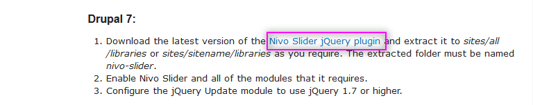 Al buscar el módulo dice que necesita de otros dos módulos para funcionar correctamente, estos módulos son Libraries API y jQuery Update. Aparte de esos módulos es necesario descargar el plugin de Nivo Slider